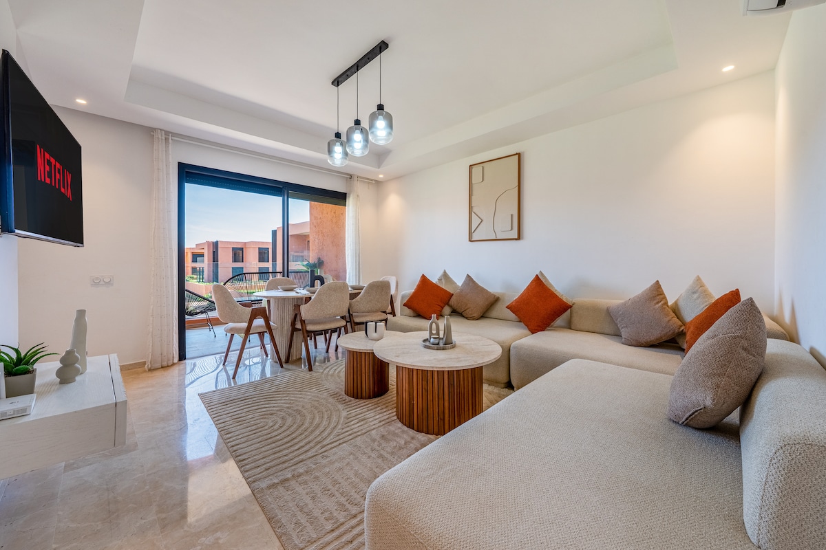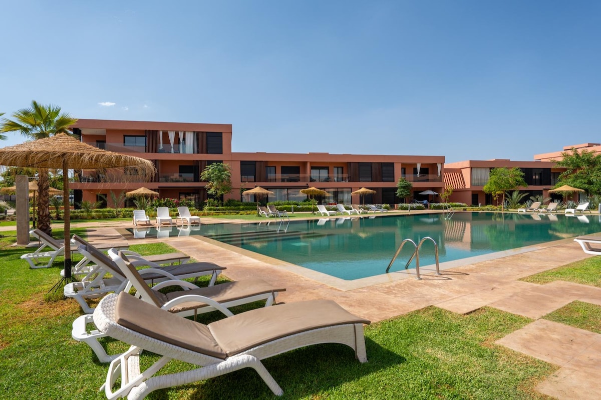 Escape to this stunning Luxury Apartment in Marrakech's notorious Noria Golf Residence. Enjoy a captivating view of the sparkling pool and the convenience of a Dedicated Workspace with ultra-fast Fiber Wi-Fi . Perfect for Families,Remote workers,and Group of friends Comfortably sleeps 5 across 2BR/2BA. We offer premium amenities including Washer/Dryer, Nespresso/Air Frier, Free Secure Parking, baby crib. Just 10 minutes from the Airport and a short taxi to the Old Medina and Gueliz city Centre