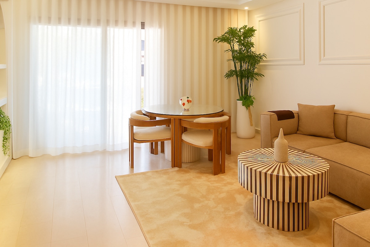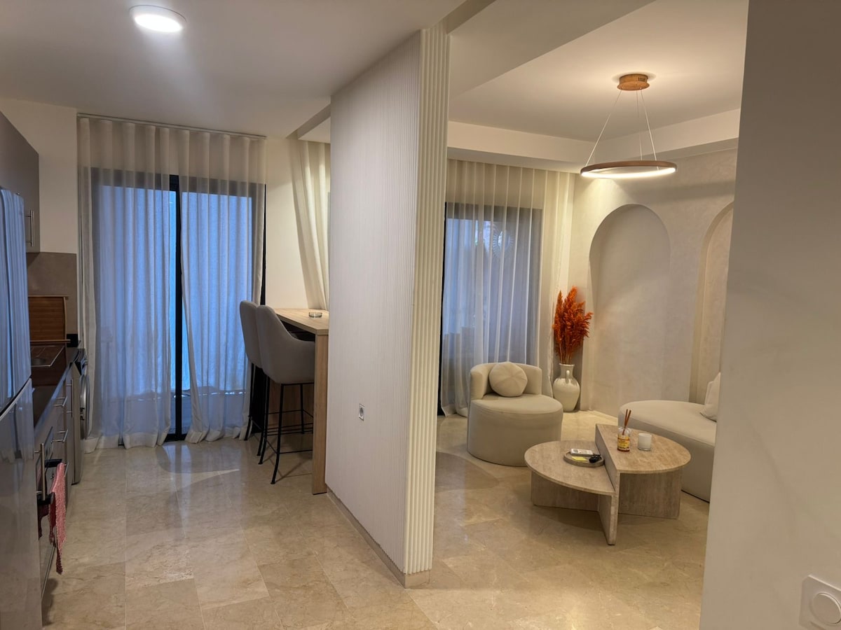 Séjournez en plein cœur de Marrakech dans notre appartement 2 chambres et 2 salles de bain. Profitez d'une literie Simmons haut de gamme, WiFi haut débit (fibre optique) et d'une décoration moderne avec une touche ethnique. Cuisine entièrement équipée, baignoire élégante, et douche italienne. À quelques pas de la place Jemaa el-Fna, du Plazza, et du Carré Eden. NB : Les couples marocains non mariés ne sont pas autorisés.