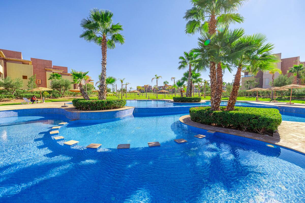 Venez profiter de ce magnifique havre de paix de 100 m2 dans la résidence privée Al Qantara avec 3 piscines au coeur de la zone touristique. Idéalement situé à 10 min de l’aéroport et de Gueliz, 5 minutes de Jamaa El Fna, 800 mètres du centre commercial Al Mazar, 5 min du Menara Mall et à 8 min du Atlas Golf Marrakech. Il est entièrement équipé, vous y trouverez tout votre confort. Possibilité : - Transport depuis l’aéroport - Activités touristiques Piscine ouverte toute l’année (non chauffée)