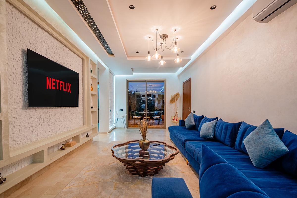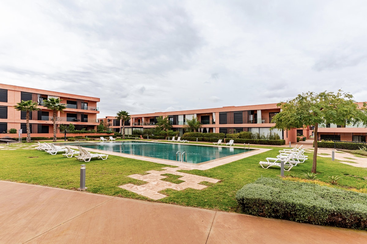 Escape to this stunning Luxury Apartment in Marrakech's notorious Noria Golf Residence. Enjoy a captivating view of the sparkling pool and the convenience of a Dedicated Workspace with ultra-fast Fiber Wi-Fi . Perfect for Families,Remote workers,and Group of friends Comfortably sleeps 5 across 2BR/2BA. We offer premium amenities including Washer/Dryer, Nespresso/Air Frier, Free Secure Parking, baby crib. Just 10 minutes from the Airport and a short taxi to the Old Medina and Gueliz city Centre