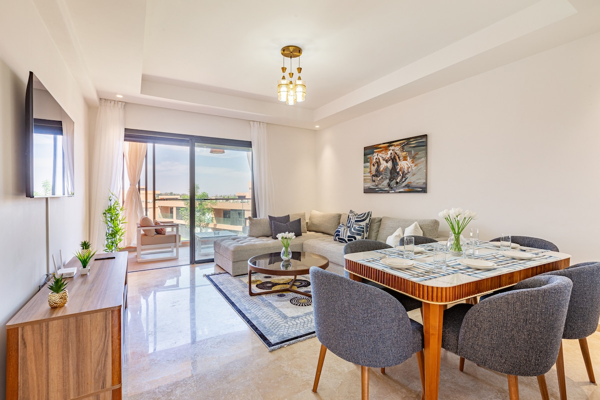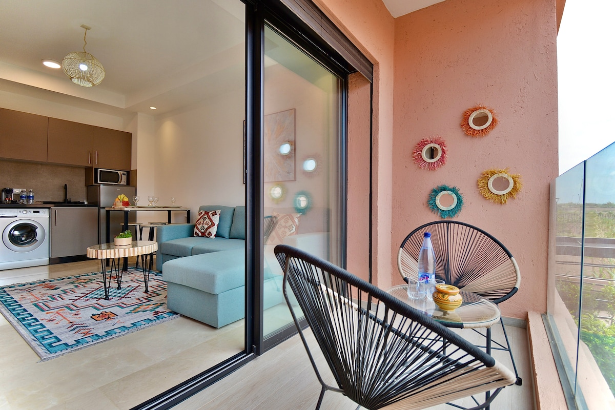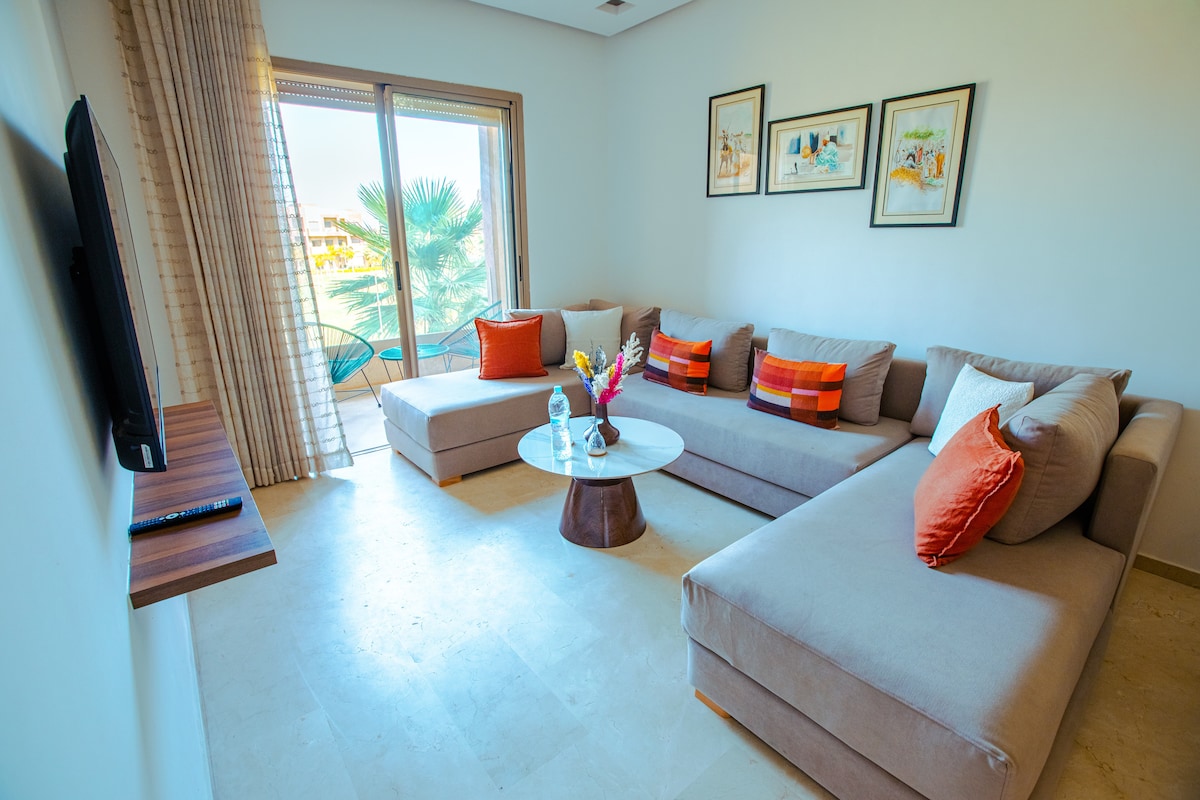 Relax in this bright, fully equipped 1-bedroom apartment located in Domaine de Noria in Marrakech, just 10 min drive from the airport and 15 min from Medina and Hivernage. Perfect for couples or small families. Amenities: Towels + bedsheets Queen bed + Sofa bed Full kitchen Pool High speed Wi-Fi (Optic Fiber) & 2 TVs Balcony AC Private parking with 24/7security Garden & kids’ playground 4min walk to one of the city's best bakeries & Café Baby crib (available upon request)