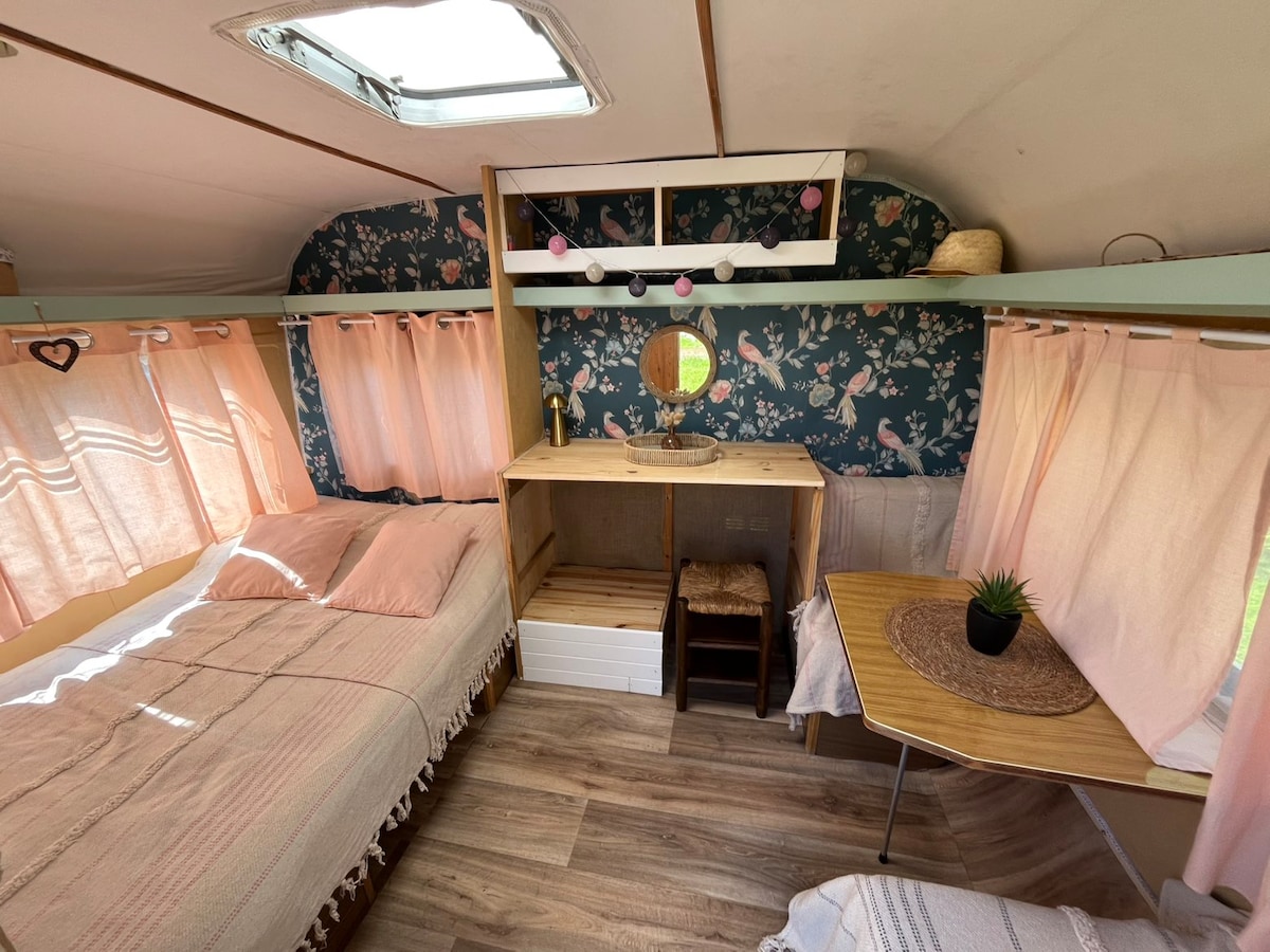 Une seconde vie pour cette petite caravane Adria vintage de 1970, avec couchages deux personnes et ça cuisine équipée, réchaud à gaz, grand frigo,micro onde, bouilloire, cafetière Et aussi pour ce cabanon de jardin, transformé en cabane du pêcheur attenant à la caravane, où l'on y trouve, douche, toilette sèche. Merci de bien noter que ce logement est une caravane vintage restaurée, pour éviter les déceptions !! Type camping 😊