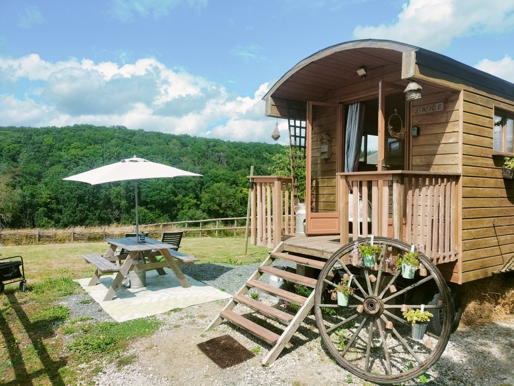 Face à la forêt, à 1, 2, 3 ou 4 venez découvrir notre campagne. Atypique et tout confort ! Cuisine : évier, plaque de cuisson, micro onde, grille pain, machine à café Tassimo (qq dosettes et thé fournies). TV, clim, WC sec, douche dans une cabane à côté. Linge de lit et serviettes de bain fournis. 1 Lit de 180 & 1 de 130. Grande terrasse. Parking pouvant accueillir, vélo, moto, voiture, camion, camping car .... Autres gîtes sur notre domaine de la Dolce Vita