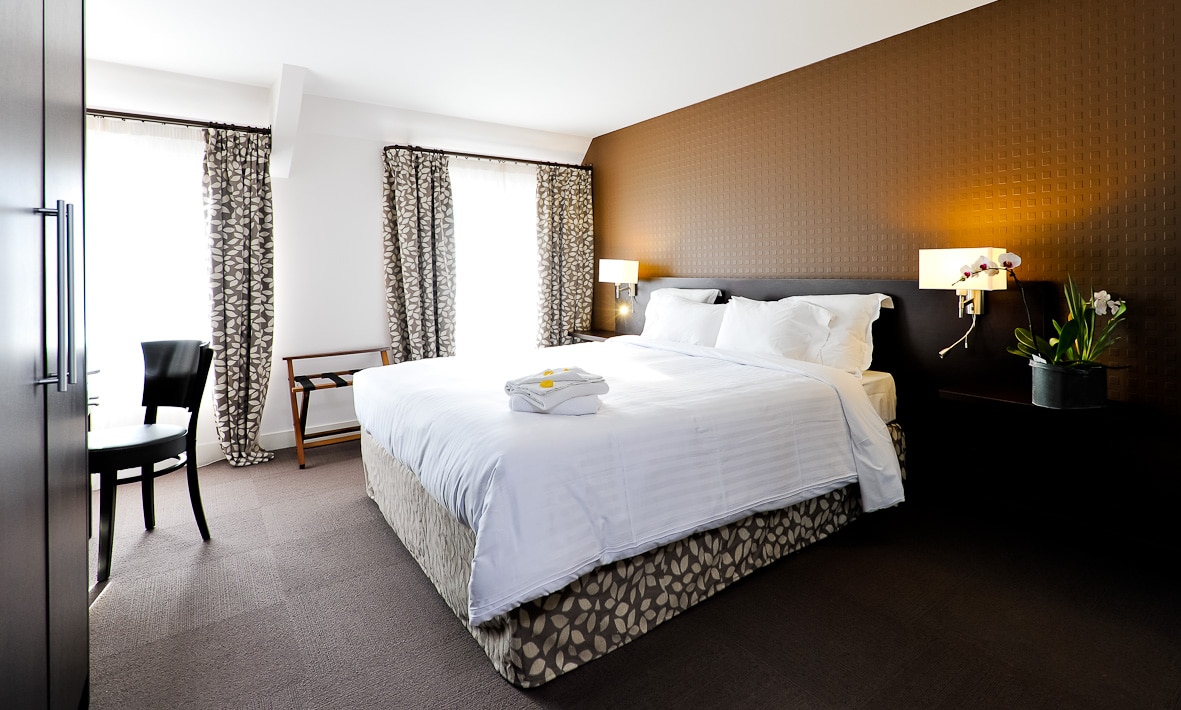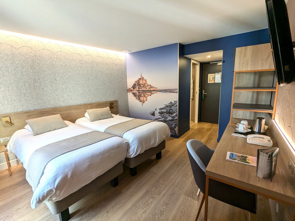 Découvrez une chambre élégante et chaleureuse dans notre hôtel 4 étoiles, où confort et raffinement se rencontrent. Profitez d’un accès non privatif à notre espace bien-être avec sauna, hammam, douche sensorielle et jacuzzi pour un moment de détente absolue, accessible sur réservation d'un créneau de 45min. Venez vous restaurer dans notre restaurant "La Table du Conquérant" et profitez de notre nouvelle carte proposant des produits frais, locaux et fait maison.