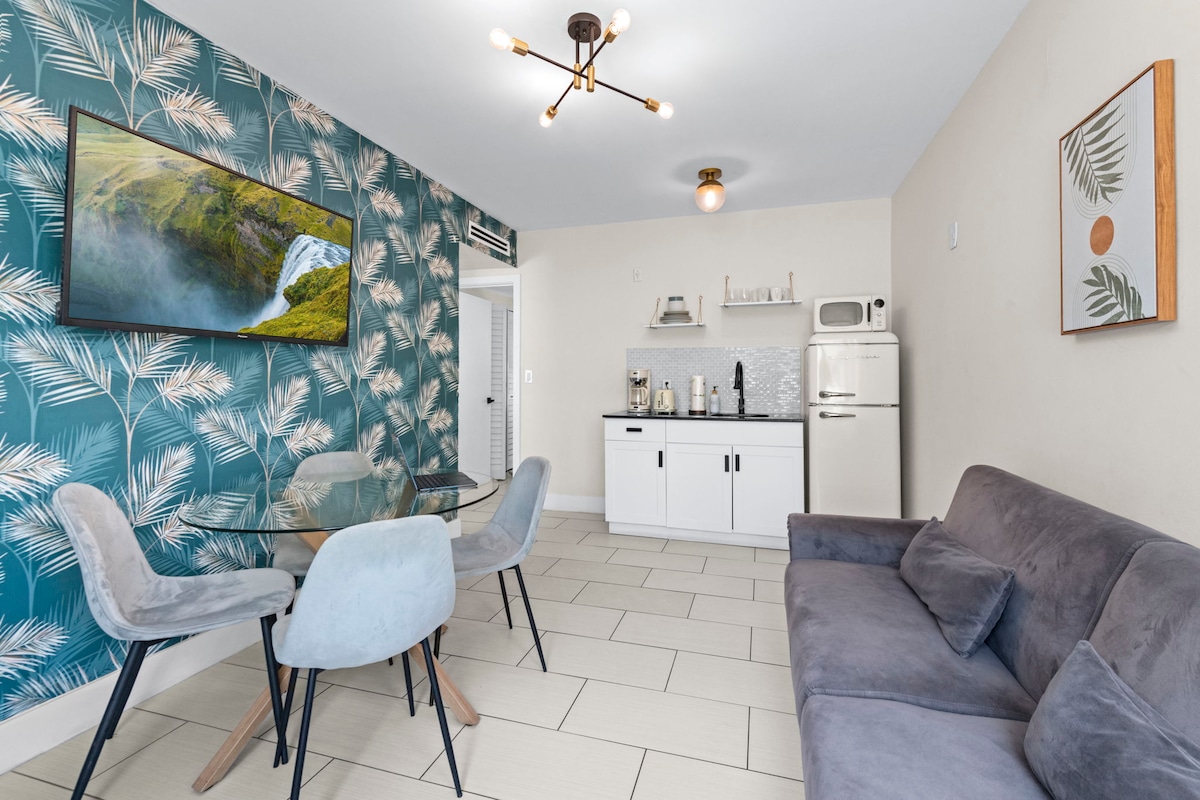 Discover the secluded charm of North Beach in Miami Beach, where a cozy private apartment awaits just a block away from the sandy shores. This intimate retreat offers a bathroom, two beach chairs with an umbrella, portable coolers, and a quaint dining table. Perfect for two guests, it features a queen bed, WiFi, and a smart TV. Finding street parking may be difficult during evenings, and weekends. While a full kitchen isn't provided, a microwave and refrigerator are on hand for convenience.