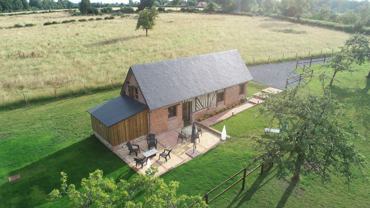 La fourniture du linge de lit, des serviettes de toilette, des torchons et du bois de chauffage en saison est incluse. Vous profiterez d'une maison de campagne entièrement rénovée en 2020, sur une propriété de 2 ha, occupée par quelques moutons et chevaux. Typique normande, la maison n'en demeure pas moins très lumineuse. Deux terrasses, dont une couverte, permettent de déjeuner dehors, même les jours de météo incertaine. Accès WIFI (Fibre haut débit)