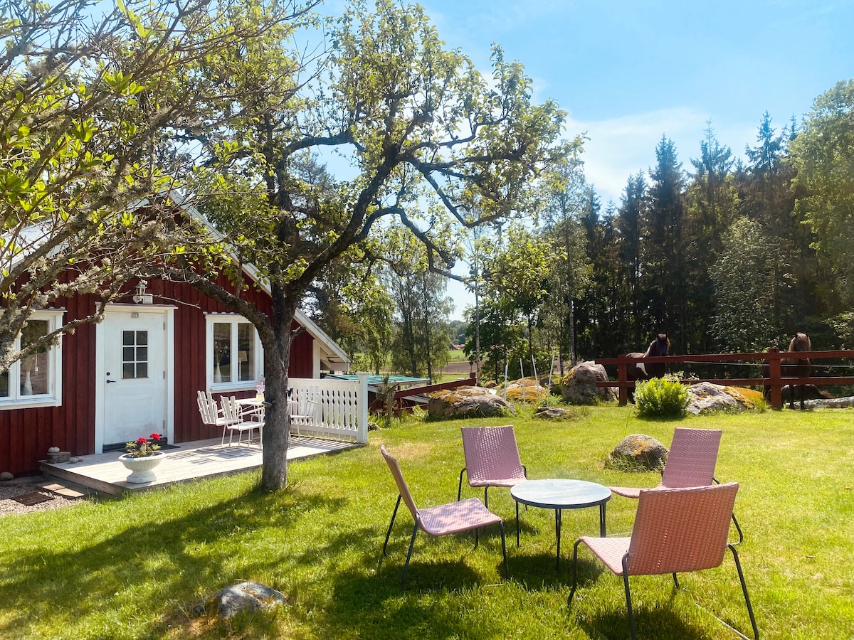 Mysig liten stuga med sovloft, AC och värme – bara 5 min med bil till Astrid Lindgrens Värld och centrala Vimmerby. Tillgång till pool, uteplats, trädgård och en badstrand 500 meter bort. Perfekt för en avkopplande semester med närhet till både natur och nöjen. Charming Cottage Near Astrid Lindgren’s World Cozy getaway with pool, garden, and swimming lake within walking distance – ideal for families!