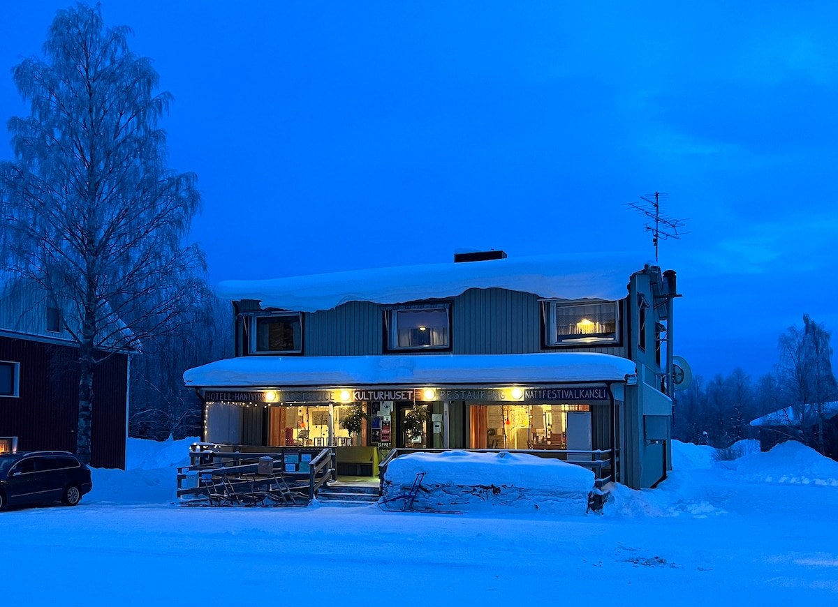 You won’t want to leave this charming, one-of-a-kind place. In the beautiful small village hotel in Korpilombolo, you can book both rooms and hostels. A relaxing environment with a simpler standard is offered here as well as long-distance guests or business travelers.