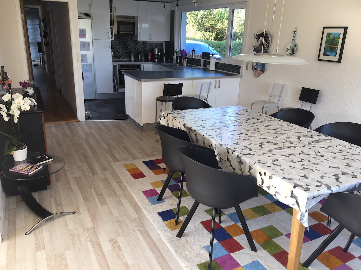 Kom og nyd roen på landet. Dejligt lyst hjem med udsigter til mark og skov fra alle vinduer så langt øjet rækker. Smukt lysindfald i stuen hele dagen, hvorfra der kan ses rådyr, harer og forskellige fugle. Fuldt funktionelt køkken med filterhane til renset vand og opvaskemaskine. Ude i den store have der er vild med vilje er der bålsted, gynger, trampolin og sandkasse. I huset er der babystol og legetøj.