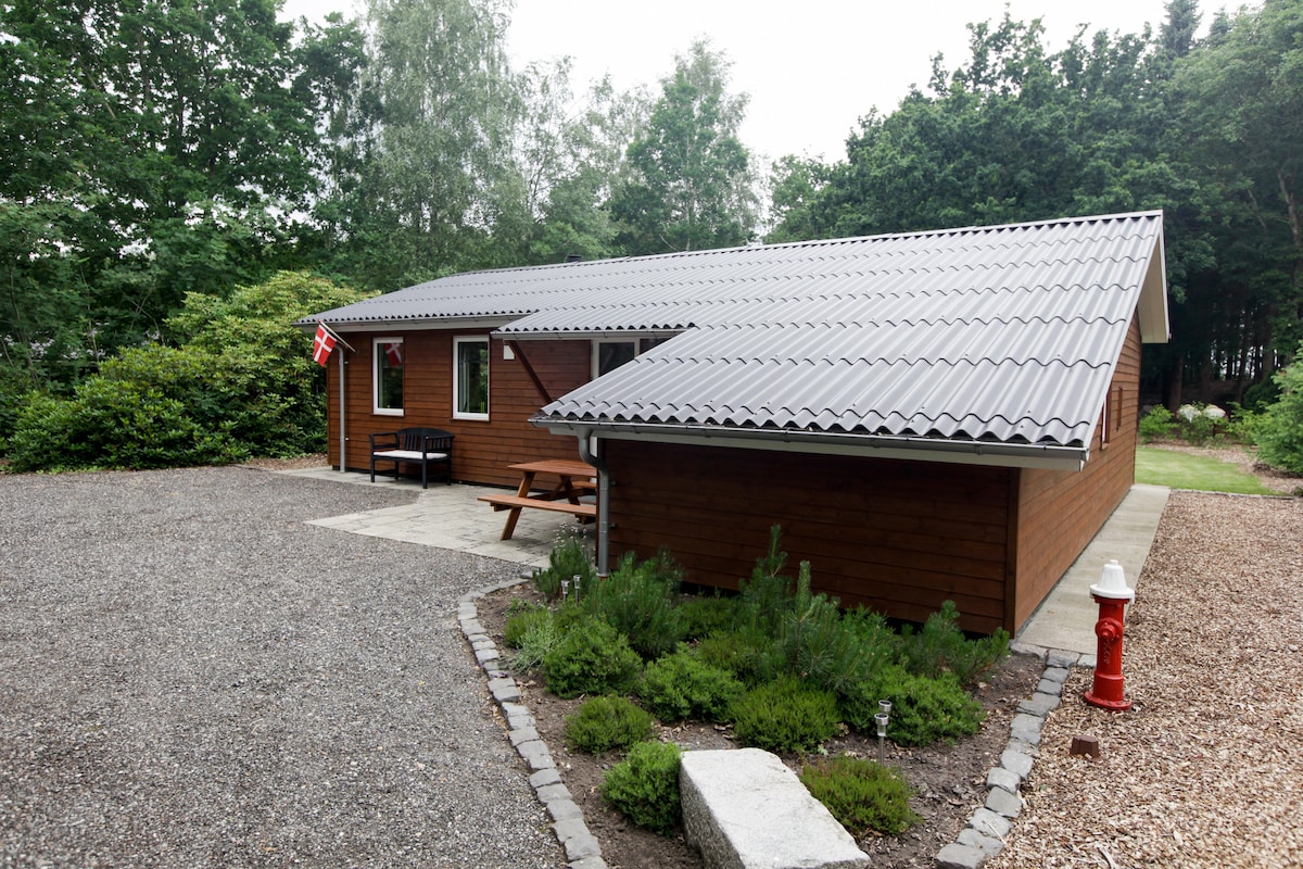 Relax in a comfortable cabin, in your own small forest of old trees, right down to the beautiful lake. The peaceful private paradise is only 20 minutes from Legoland, and the bench by the dining table is full of Lego Duplo ;) The covered terrace with daybed, the new wood-burning stove, the lightning-fast internet and the large smart TV ensure a holiday in all kinds of weather! You Will love this after a bussy day i the parks :)