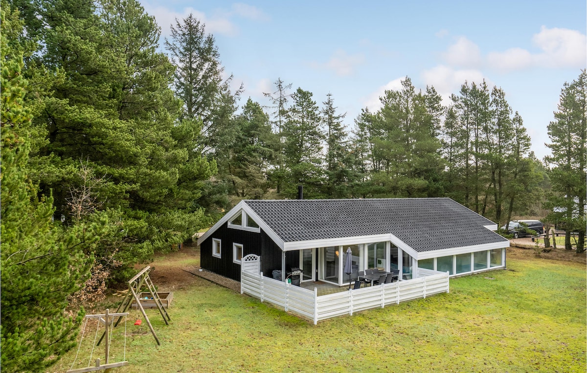 Enjoy a fabulous holiday in this impressive holiday home, located in the heart of charming Søndervig, just 150 meters from the enchanting North Sea beach. With space for up to 10 people, this house is the perfect retreat for families and friends seeking an unforgettable holiday experience. This spacious holiday home spans 240 m² and offers three luxurious bedrooms in the main house, all furnished with comfortable double beds. One bedroom has an en-suite bathroom with a shower and bathtub, as well as a walk-in wardrobe, while the other two share a large bathroom with a shower. The entire house features underfloor heating, powered by an energy-efficient heat pump, ensuring optimal comfort year-round. The separate guest house contains two additional bedrooms, each with its own toilet and shower. A shared living area includes a kitchenette with a refrigerator, wine cooler, and dishwasher; however, cooking is not permitted in this kitchenette. Look forward to unforgettable moments in the fantastic outdoor wellness area, where a large pool, a built-in whirlpool, and a refreshing outdoor shower await you, offering ultimate relaxation and enjoyment. The huge wooden terrace, extending over several levels, offers breathtaking views of the stunning dune landscape and invites you to spend long, relaxing hours outdoors. In the main house, you'll find a large, open-plan kitchen connected to the dining area by a breakfast bar, perfect for spending quality time together. The living room, with its large windows, is flooded with natural light and allows you to enjoy the spectacular views, not just while eating. Built in 2009 and renovated in 2022, it features modern and comfortable furnishings to ensure a pleasant stay for all guests. Explore charming Søndervig, which offers a variety of activities and attractions, including local shops, restaurants, and cultural events. Take long walks on the beach, explore the surrounding dunes, or try kitesurfing, windsurfing, or other outdoor activities with local providers nearby. This fantastic holiday home is the ideal choice for an unforgettable holiday on the North Sea coast. Book your stay now and look forward to creating wonderful memories! The pool is closed from 1/10 to 1/4. However, the outdoor spa is switched on all year round.