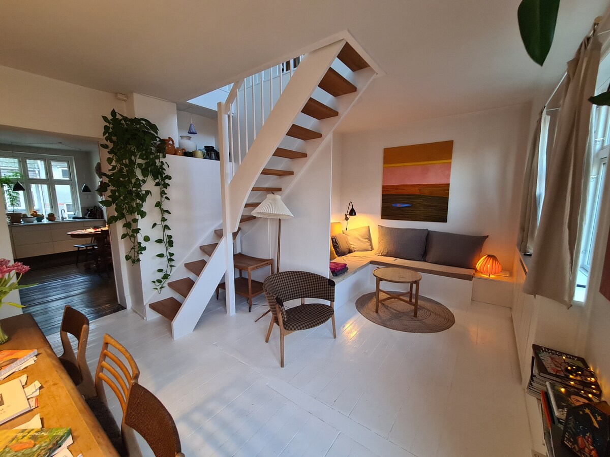 Cozy, stylish one-bedroom apartment with a huge comfy bed and unique interior. Perfect for couples, with a social open kitchen/living area and a spacious sofa for a third guest. Enjoy the private balcony with seating and heating lamp overlooking a quiet courtyard. Located on a calm street, just a few minutes walk from lively Stefansgade and Jægersborggade, with local favorites like Hart Bakery and Stefanshus just around the corner.