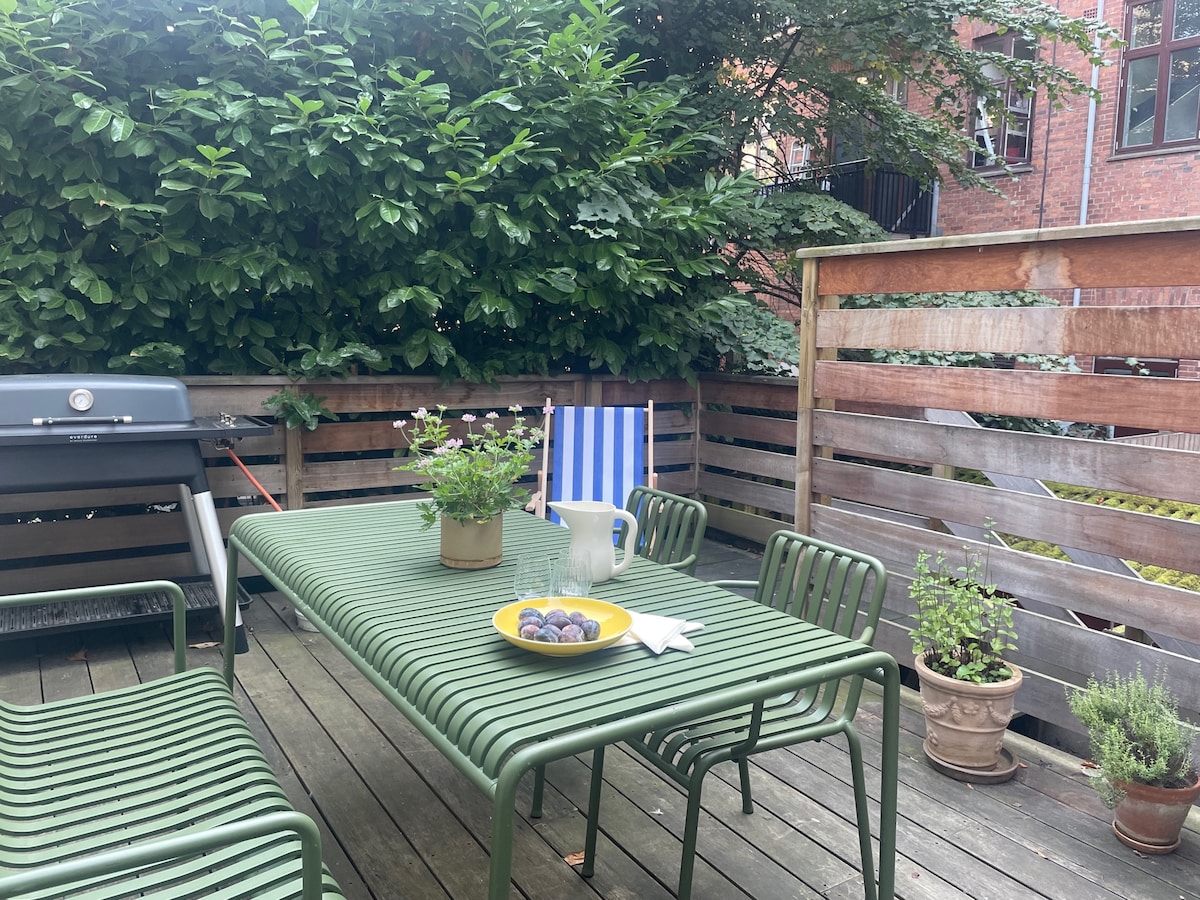 Welcome to your own townhouse with roof deck and courtyard. It's smack in the middle of Copenhagen City Centre, next to the King’s Palace and steps from the Metro; Marmorkirken, yet it’s quiet and peaceful. The unique building used to be an old bakery converted into residential and offers 3 spacious floors with privacy even for multiple guests or families (one full kitchen and kitchenette, 2 full bathrooms), 3 dining areas for 8 people (1 indoor, 2 outdoor). Note private belongings in property