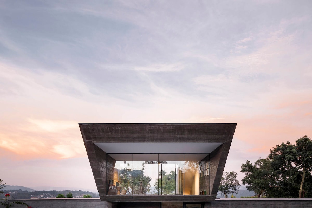 Nestled into rural Portugal, this concrete villa strikes a modern contrast against its lush, natural surroundings. Soaring leafy trees rustle in the breeze while casting dappled shadows across the manicured yard. Glass walls allow sunlight to stream inside, soaking the contemporary décor in golden rays. A hammock offers a place to chill out after swimming leisurely laps in the ample azure pool. Copyright © Luxury Retreats. All rights reserved.