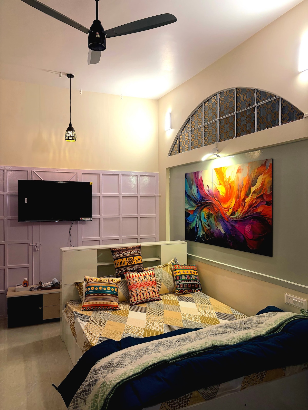 When in Kolkata, we are your home away from home at Salt Lake City! When you step into our home, you enter the Incredible India story and our age-old philosophy of hospitality - "Vasudhaiva Kutumbakam" which means the entire world is one family. Soothingly done up with a mix of handcrafted decor pieces, hand-painted folk art by artists from rural India, antique style furniture, soft and warm lighting, a large patio or balcony - it's a perfect comfortable couple-friendly private home-stay.
