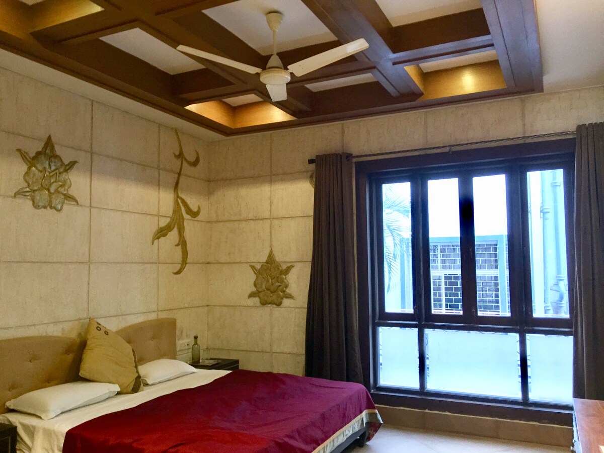 A large, luxurious en-suite room with memory foam mattress, TV, wooden floor and split AC in a city-centre villa. Guests can access the living room, balcony, dining room, and kitchen. We have fast Wi-Fi and fresh home-cooked Indian vegetarian food.