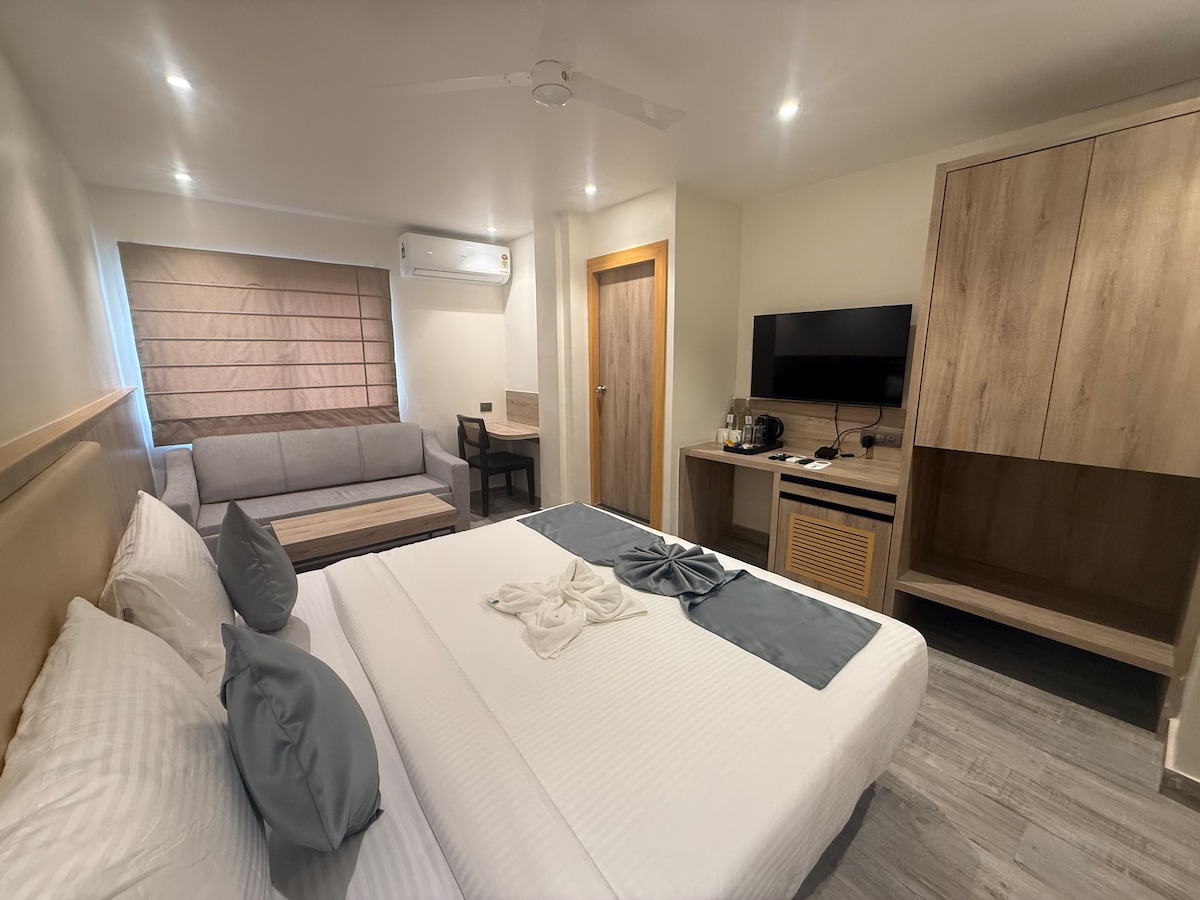 Our Spacious Premium Deluxe Room features a larger, well-planned layout designed for enhanced comfort and relaxation. The room offers ample space to move freely, unwind, and enjoy a peaceful stay in a clean and comfortable environment. The room includes modern interiors, air conditioning, free Wi-Fi, a flat-screen TV, fresh linen, and a private bathroom. Ideal for solo travelers, couples, and business guests looking for a spacious, premium hotel room near the Kolkata airport.
