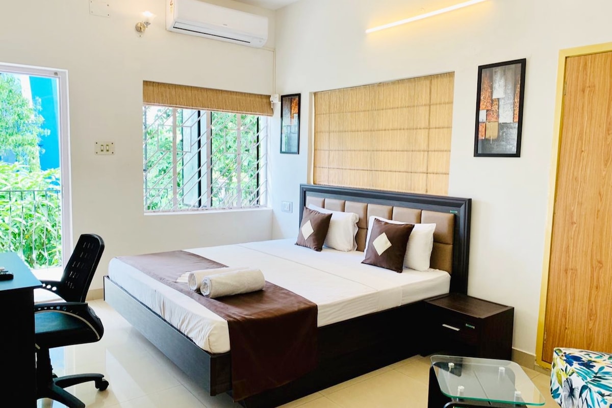 Ebb Is a delightfully bright airy space with a relaxed vibe, it's a serviced two bedroom apartment with a terrace area Located centrally and easy access to all restaurants, malls, hospitals and tourist spots of the city You can choose this stay whether you are in the city for a business trip, a family trip, a staycation,medical stay etc It's located on the first floor with an elevator and 24 hours security and one car parking The zen and minimal interiors provide a blissful feel :)