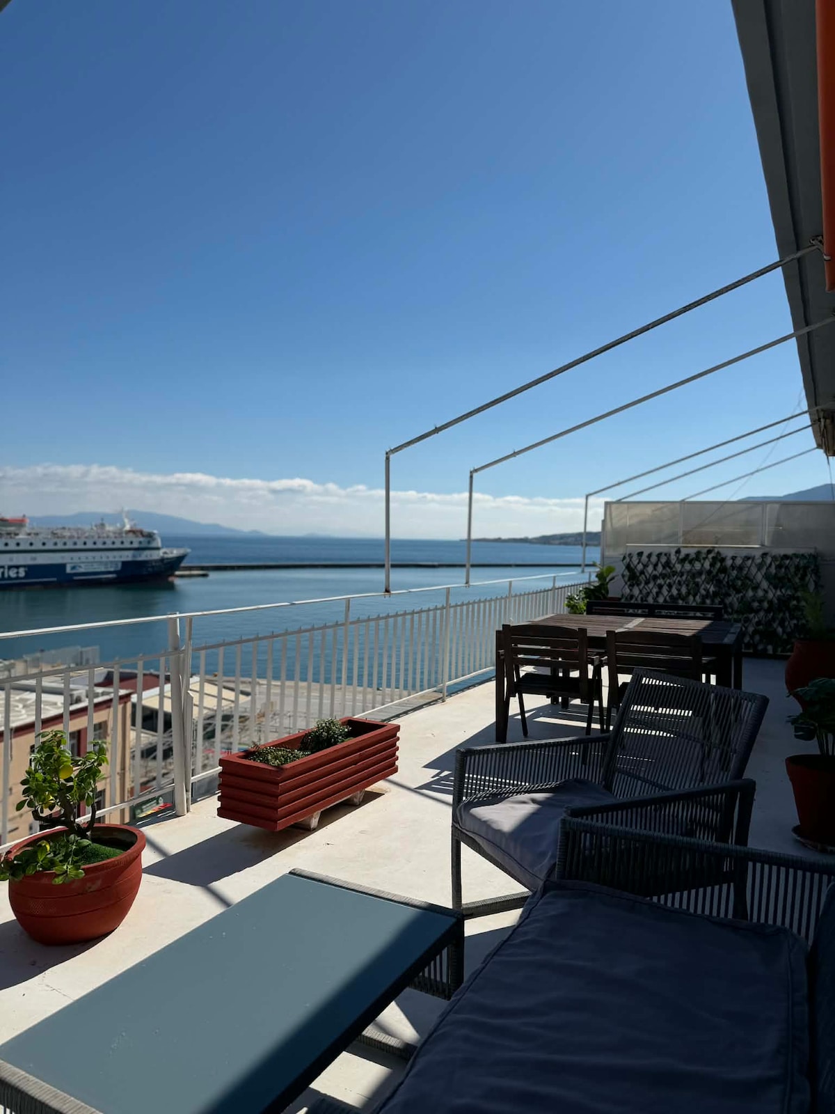 Fenestra Mare is a peaceful retreat in Chios for couples, families, and remote workers. Just 5 minutes by car from the town and Agia Paraskevi beach, it features private parking, a sea-view balcony, full A/C, two cozy double bedrooms, a fully equipped kitchen, dining table, living area, and a dedicated workspace. Whether you are relaxing on vacation or working remotely, this home offers a peaceful, practical, and stylish base to enjoy everything the island has to offer.