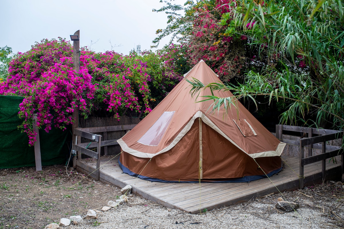 Reconnect with nature in comfort Immerse yourself in a glamping experience inside our spacious Lotus Belle Tent. Enjoy comfortable sleeping arrangements, a private terrace with stunning views, a barbecue area, cozy hammocks, and sunbeds. Evenings are extra warm and inviting with our outdoor gas heater pyramids, perfect for stargazing in comfort. Each tent also comes with its own private outdoor toilet and shower for your convenience