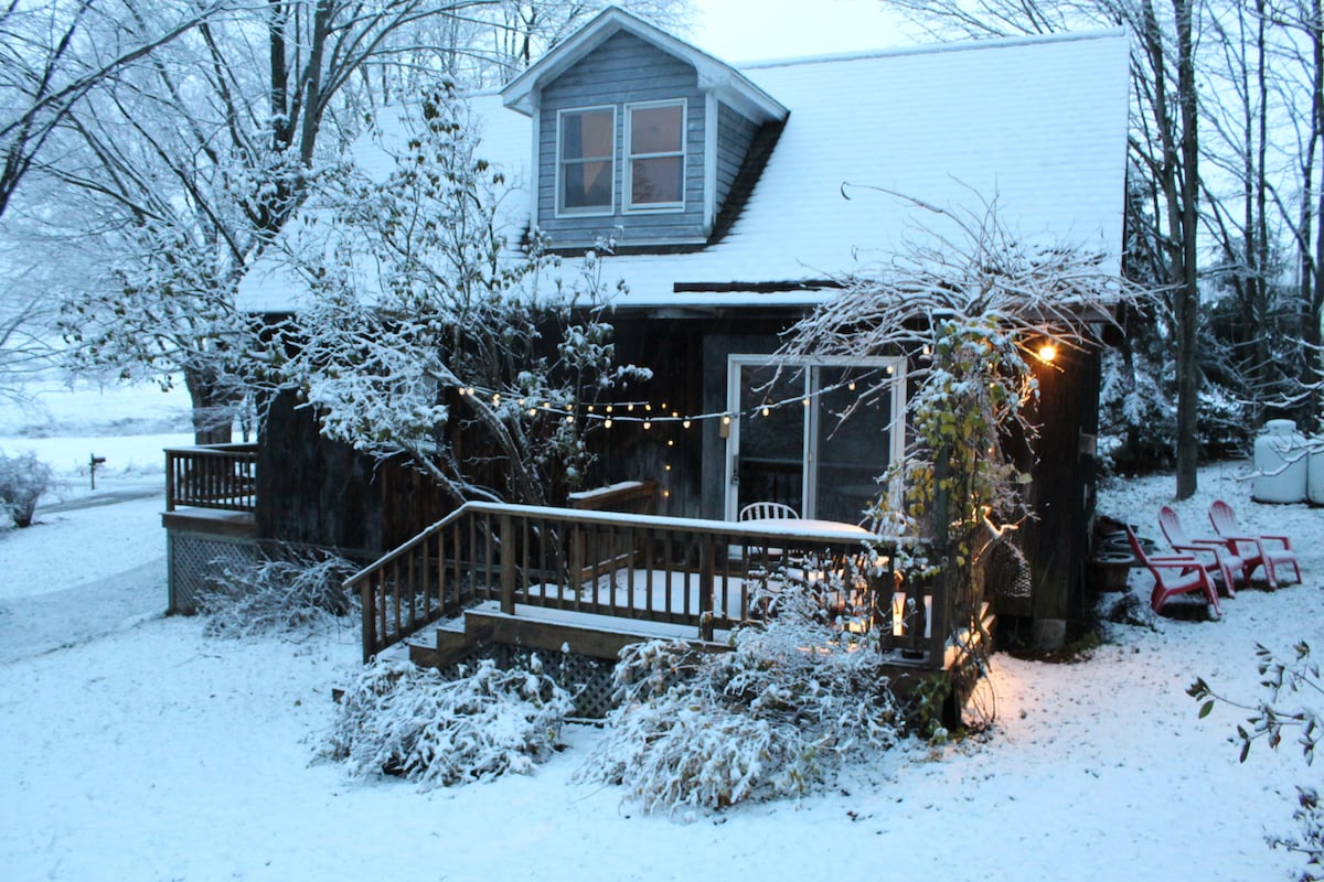 Private guest lake house, located next to main house, on private lake in the country. 2 bedroom, 1 full bath, full kitchen, washer and dryer and large attached screen porch. Private 37 acres of woods and prairie. Fishing and walking trails. Great window views of lake, woods, prairies and river valley. Please note, this guest house is located 1 mile down a county maintained gravel road. 25 minutes from Galesburg, IL, 20 minutes from Monmouth, IL and 35 minutes from Macomb, IL.