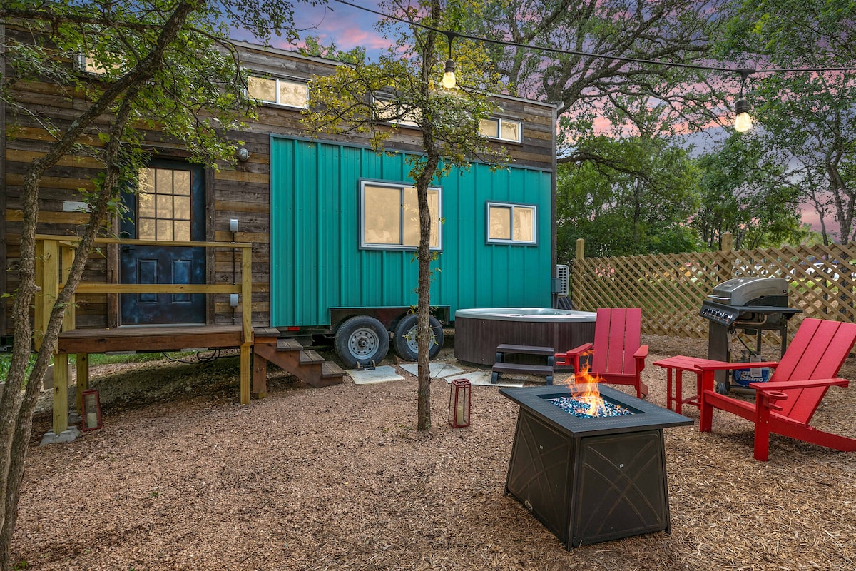 Willie is a cozy, charming tiny home nestled in the Gladheart community just minutes from downtown Fredericksburg. Enjoy a relaxed glamping vibe with modern comforts, a full kitchen, lofted sleeping spaces, and a spa-like bath. Unwind in your private hot tub, gather by the fire pit, and soak in peaceful countryside views—close to town, yet a world away.