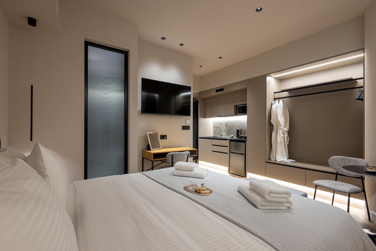 Suite 201 is ready to welcome you to a bright, comfortable, and newly renovated room overlooking the Athens City Hall. It features a fully equipped kitchen, a modern bathroom with a smart mirror, a king-size bed, a 65" TV, Starlink Wi-Fi, A/C, and electric blackout curtains. With a cozy armchair-bed, a desk, and plenty of storage space, it offers a stylish and relaxing stay in the heart of the city. Just 300 meters (4 min. walk) from the metro, you can explore Athens quickly and easily.