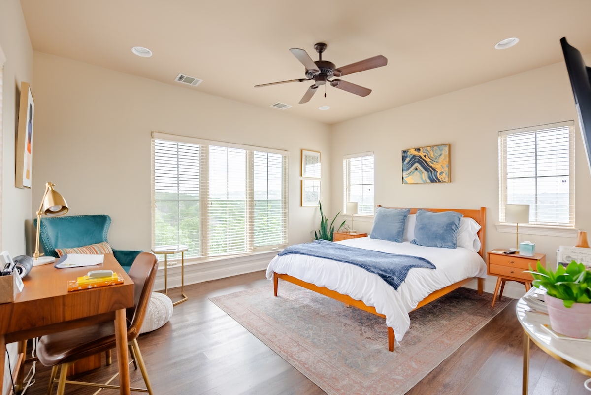 * Please note: This room does not have a TV. Instead, we focus on wellness and provide a selection of books for a relaxing stay.* Welcome to our Boho Studio in North Austin w Private Entrance! Nestling between HWY I-35, 183 and MoPac, the centrally located studio makes it easy to access any part of Austin. Minutes to Domain, Q2 Stadium (Austin FC), Moody Center, and Austin-Bergstrom International Airport.