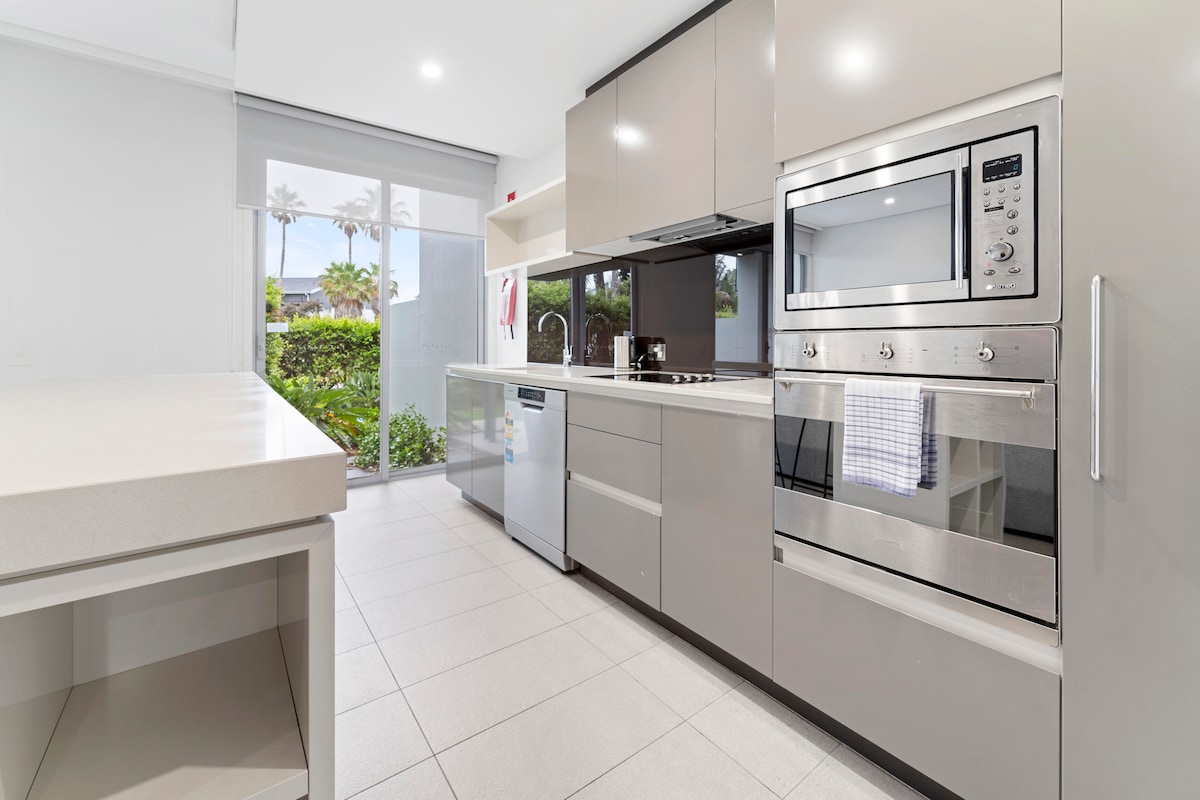 Stunning Brand New Designer Beach House. 2 minute stroll to the sand. Fully fitted out, this elevated, pristine and light-filled family home captures ocean breezes and peaceful vistas. The whole top floor is a tranquil parents' retreat. The main level boasts two queen bedrooms, a bedroom for up to 5 kids, chef's kitchen, bar, family room and second deck w/BBQ. The downstairs garage doubles as a rumpus room with table tennis, bikes, home gym and separate laundry/home office.