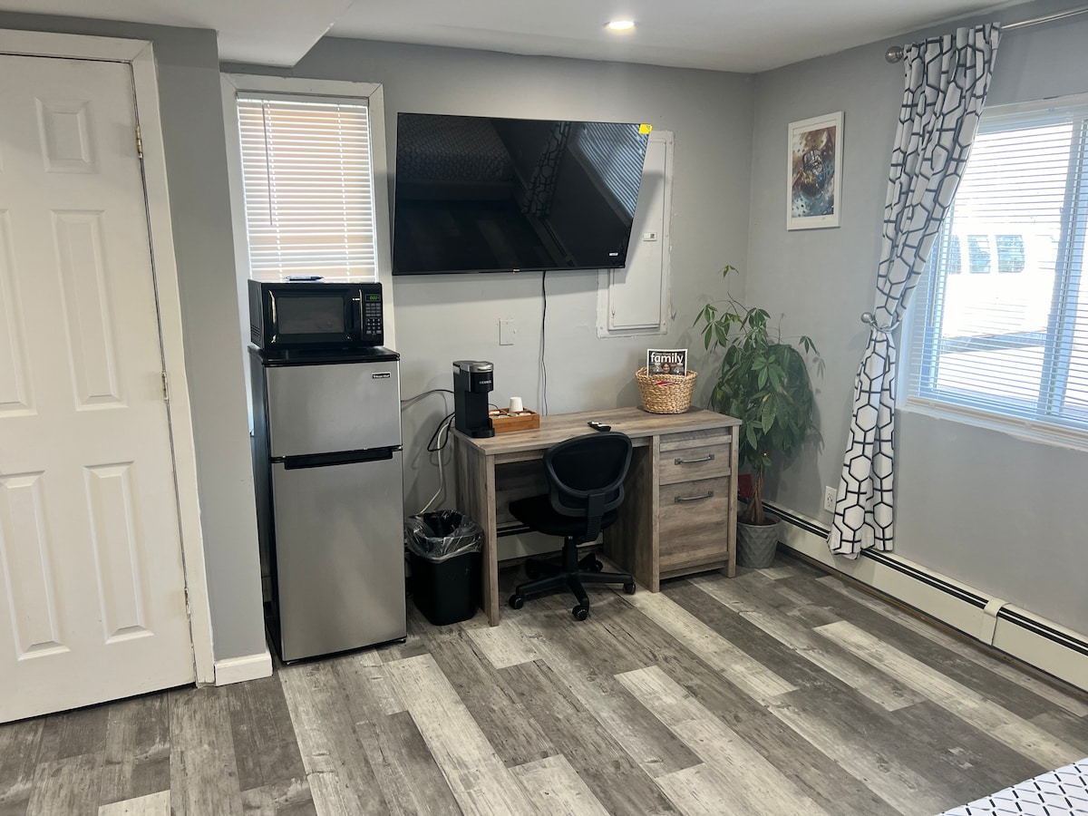 Clean, cozy studio with Private bath and Shower. Includes full size bed, large screen tv. Refrigerator, Microwave, Kuerig Coffee machine, Iron, Hairdryer and Wifi. This is a one room suite.