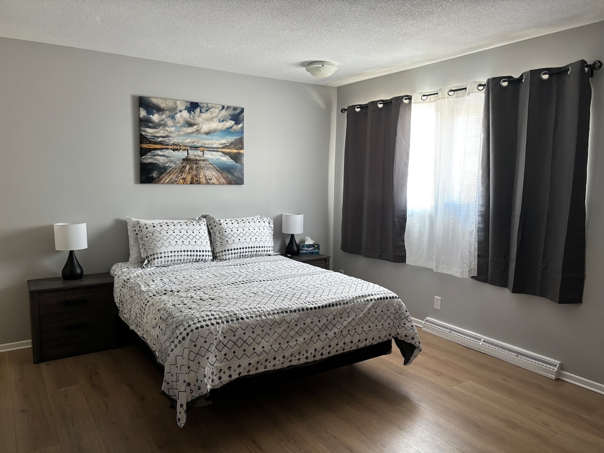 Comfortable 2 bedroom suite on quiet street. Easy access to many amenities, ample off street parking and additional storage available. The master bedroom has a Double bed and the second bedroom 2 twin beds.