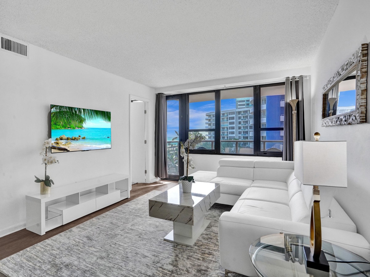 El apartamento cuenta con 93 m² distribuidos en un amplio living comedor con 2 sofá cama, una habitación principal con cama matrimonial, un baño completo y un balcón con vista al mar. Dispone de cochera gratuita dentro del edificio, laundry, gimnasio, piscinas, supermercado, canchas de tenis y un carrito con sillas y sombrillas para la playa. Disfruta de la brisa marina, el sol y la calidez de Sunny Isles con recuerdos inolvidables en este alojamiento ideal para familias.