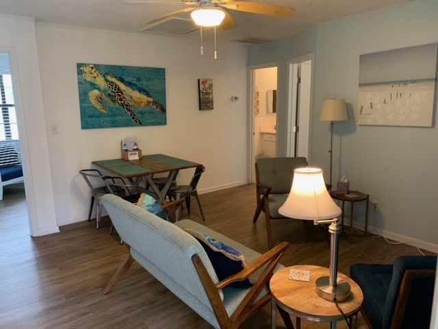 Cottage on gravel road, short walk to beach, JC Park, Tybee Lighthouse & Post Theater. Open, bright, hardwood floors, vaulted ceilings, full bath, kitchenette w/microwave, fridge & toaster - no cooktop or oven. Screened porch overlooks garden. Cottage accommodates two 25+ year adults only, no visitors or pets (owner has severe allergy to dogs). No golf carts, parking for 1 vehicle unless prior arrangements made. ID required after booking. 14 stairs lead up to cottage, no elevator.