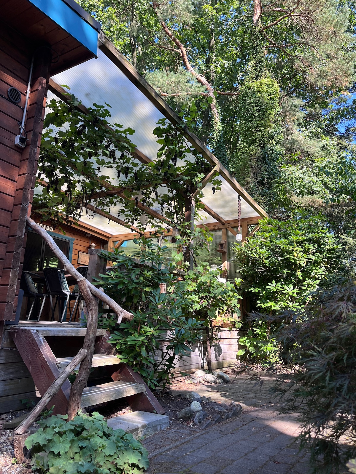 Dit gezellige houten chalet ligt in een bosrijke omgeving die uitnodigt om te ontspannen. Gelegen in het groen is het de ideale bestemming voor rustzoekers en buitenmensen. De royale tuin biedt veel privacy zodat je volledig kunt genieten van je eigen stukje natuur. Maak je verblijf extra ontspannend met een privé sauna! Extra kosten: €20 per nacht (De sauna is uitsluitend per volledig verblijf te boeken en kan niet voor losse nachten worden gereserveerd.) Betaling via Airbnb.