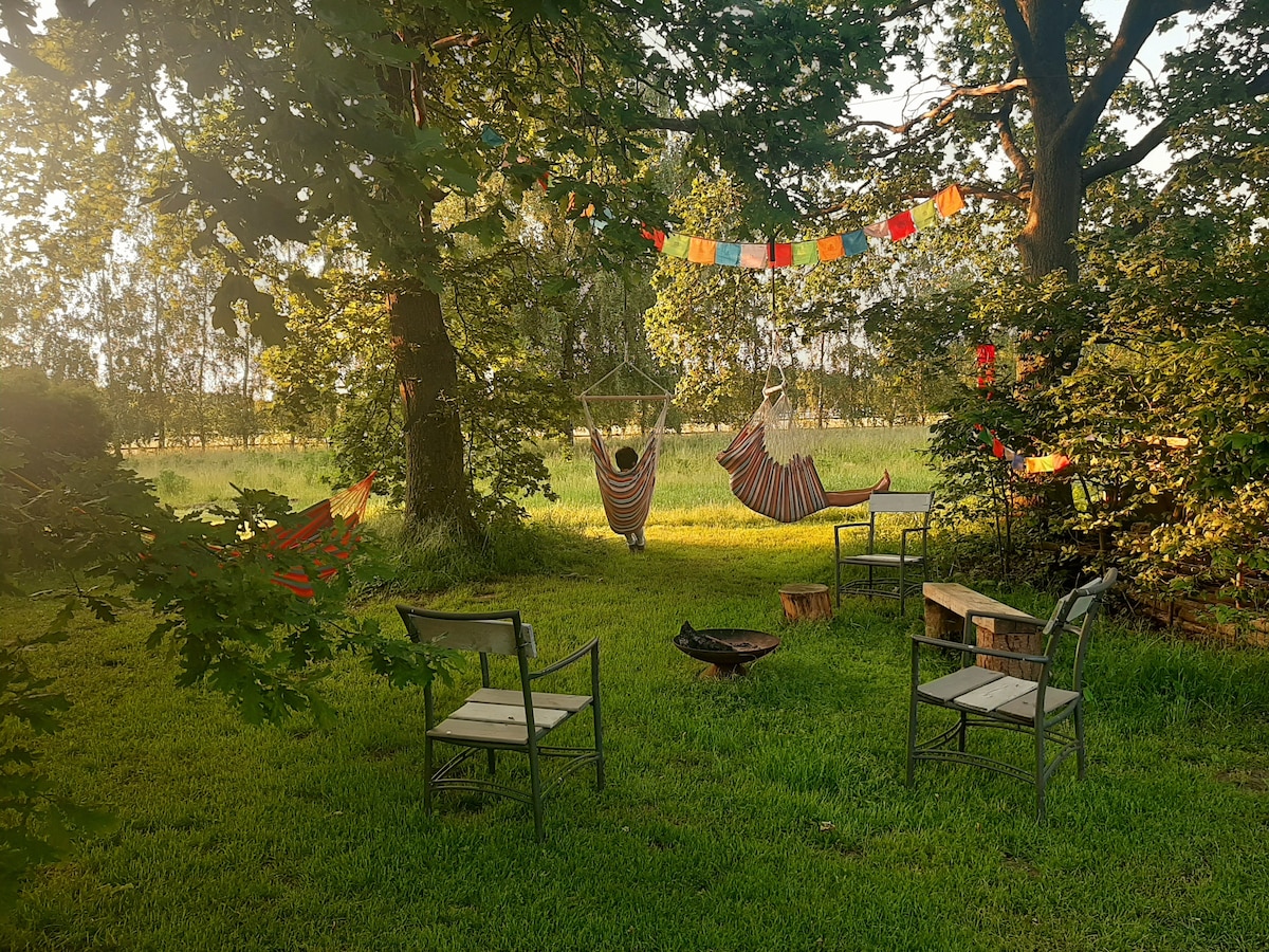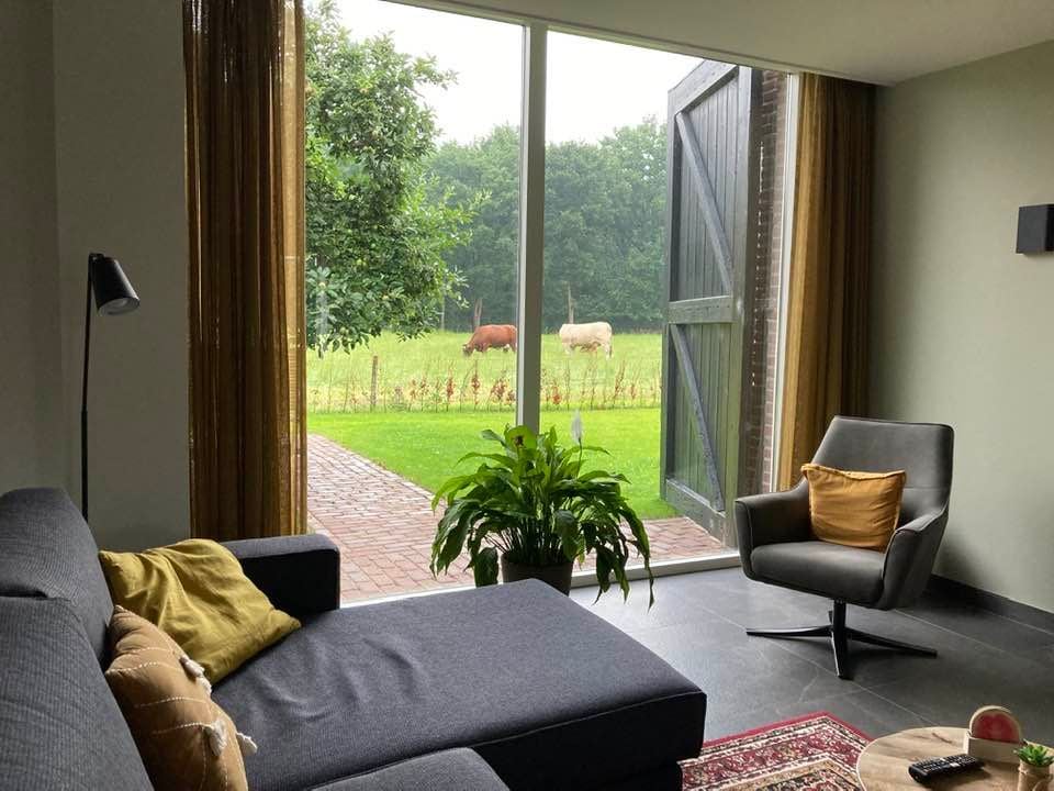 In de guesthouse voel je meteen de ontspannen sfeer. Door het gebruik van natuurlijke materialen en het uitzicht op de tuin en de dieren kan je het platteland echt ervaren. Buiten kan je allerlei dieren tegenkomen, zoals een haas of een fazant. En natuurlijk de kippen en de alpaca's. Op de loungeset die je vanuit de guesthouse ziet, kan je heerlijk relaxen. Je loopt zo de wei in om de alpaca's van dichtbij te leren kennen.