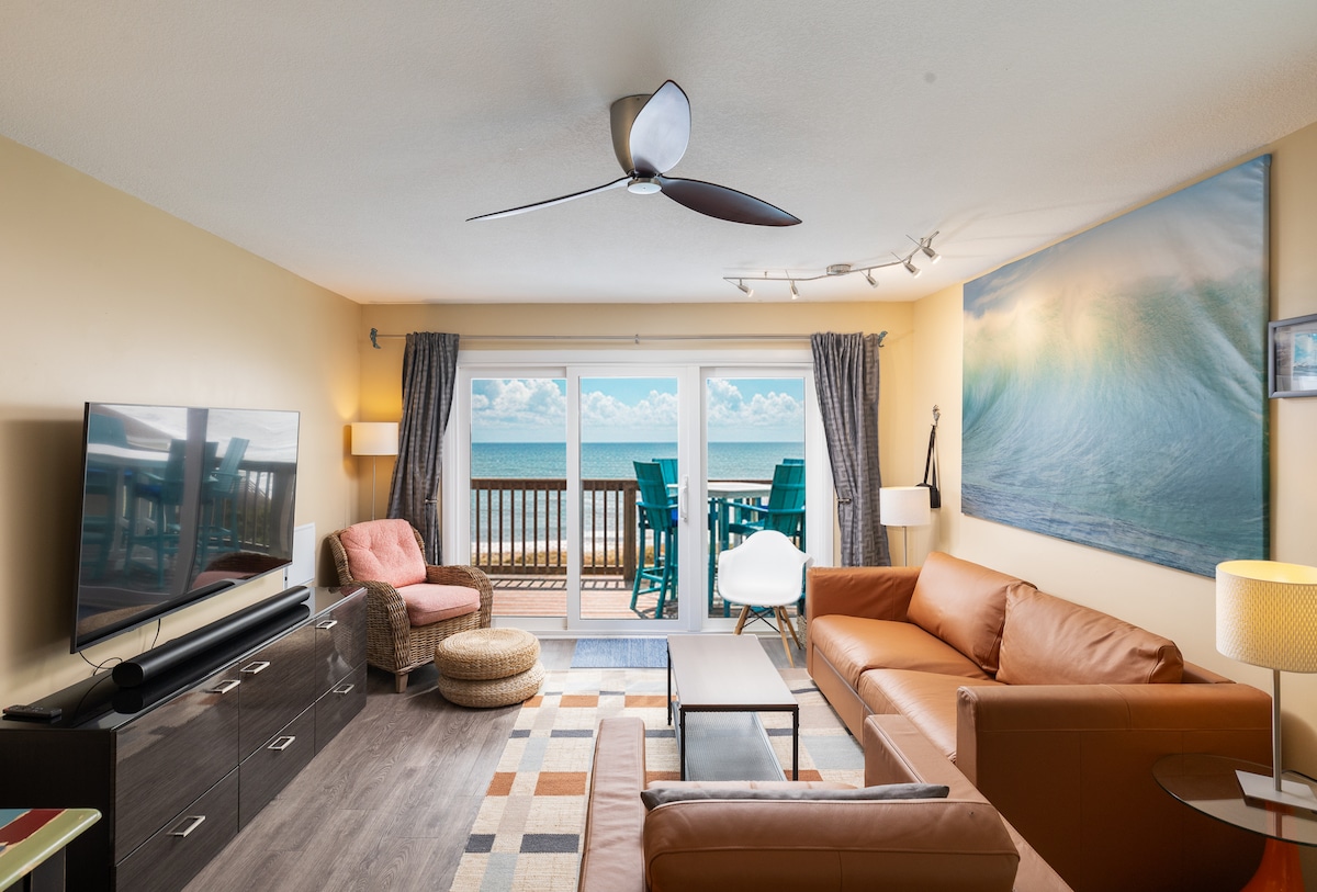 Come feel at home in our newly renovated and newly furnished oceanfront condo with beautiful 2nd floor views of the ocean from the master bedroom, living room, and deck. Extra detail was given to this unit so it would feel like home for families or couples. Only a relaxing 15 minute walk to the one of the highest rated boardwalks on the east cost! Includes access to the pool and two guest parking spaces. Beach access is just steps away. You'll love this place!