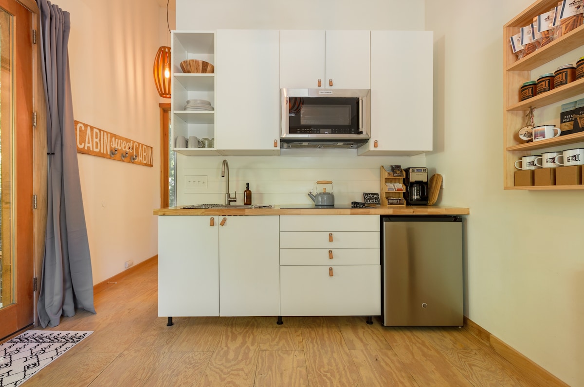 This 240 sq ft tiny house is situated on a serene 5 acre wooded property. Its a short drive to Hillsborough (10 min), Chapel Hill (15) and Durham (15). I wanted to create a space where guests can take time to rest and reset. Stylish decor, art-filled walls, and a full list of amenities make for a unique and cozy experience of home away from home. Take a step outside and you'll be surrounded by old hardwood trees and the soothing sounds of nature that make life here so peaceful