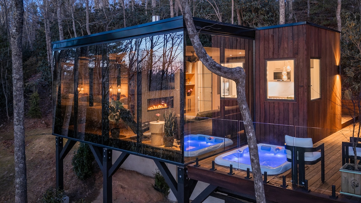 Asheville Is Calling You Back – Be Part of the Comeback More vibrant and resilient than ever — and was recently named a top 2025 destination by Forbes Travel Guide and The New York Times. Our luxury cabin is nestled in Fairview, NC, just 14 miles (22-minute drive) from downtown Asheville. Surrounded by nature, the home features a private hot tub, outdoor gas fireplace, indoor electric fireplace, and a stunning wilderness view from the master bedroom — with all the comforts of mountain life.