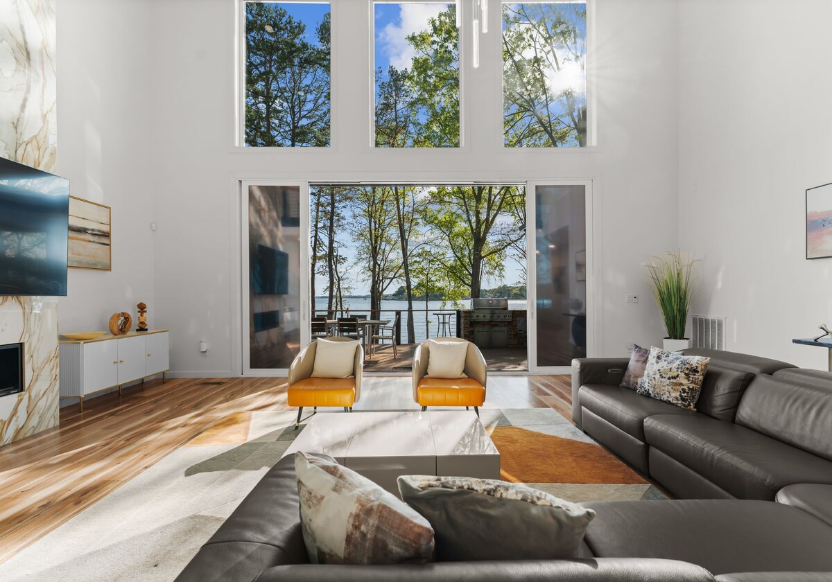 Lovingly renovated 1960s mid-century modern lakehouse with absolutely stunning main channel views and 15 feet deep water off the private dock. Enjoy over 4000 sf of lakefront living with family and friends on a beautiful gated property. Tons of outdoor living space with multi-level decking and an outdoor dining and grilling area. Only 35 minutes from Charlotte-Douglas International Airport. Boat slip on property, in addition to easy access to a public boat launch or boat rentals nearby.