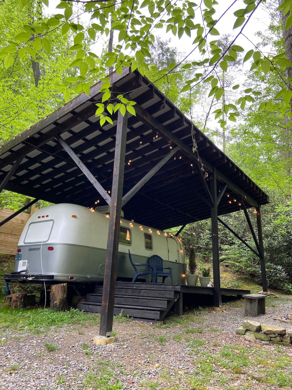 As its name suggests, The RhodoDen is a cozy 1974 Airstream Argosy nestled among the rhododendron of the Blue Ridge Mountains. Set along a trickling creek with a bonfire ring and a view of nearby Watch Knob, this is "glamping" at its finest. RhodoDen provides an idyllic place to relax, and is a great basecamp for hiking adventures, dining and nightlife in Asheville and Black Mountain, both of which are only 15 minutes away. Plus we are pet friendly! Update 3/24: We built a roof!