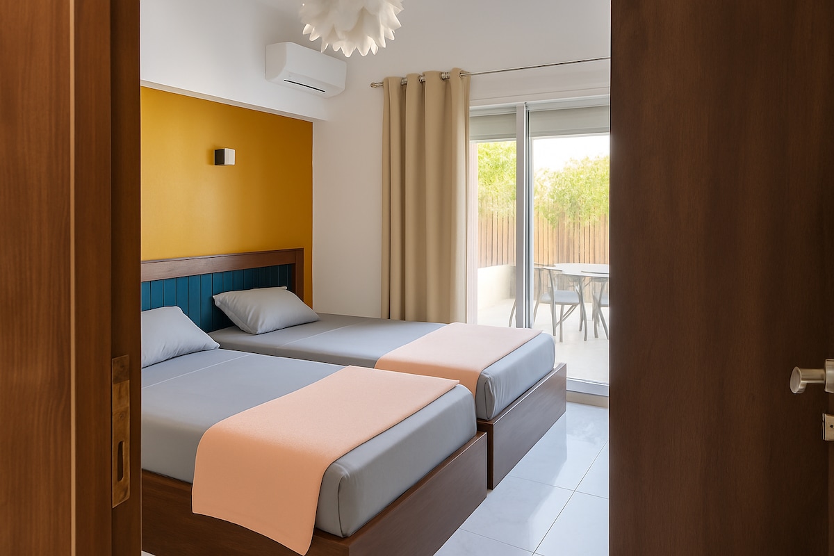 Ground Floor Chalet Paradise in Marina 5 Escape to our charming ground floor chalet in Marina 5, just a short 3-minute walk to the lake. - 2 Bedrooms, 1 Bathroom - Large Living Room & Fully Equipped Kitchen - Spacious Terrace & Private Garden - Sleeps 6 with 1 King Bed, 2 Double Beds, & 1 Sofa Bed - Air Conditioning Throughout - 2 50-Inch Smart TVs/ high speed WI FI - Newly Renovated with Modern Furnishings & Appliances Families & Groups Relaxing Getaways Beach Lovers