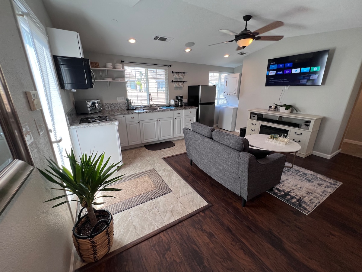 This stylish newly renovated 1 BR in-law unit has anything you need to feel at home. Enjoy a king bed, 55" smart TV, cozy nook with a twin bed, washer/dryer, level 2 EV charger, garden with flowers, vegetables and fruit trees. Fully equipped kitchenette and dining space. Close to midtown, downtown, Golden One, Cal Expo, Discovery Park, shopping, restaurants, freeway and light-rail. Near numerous hospitals. Baby gear available. Hiking & river access nearby. Day trips to SF, Tahoe, Napa & more.