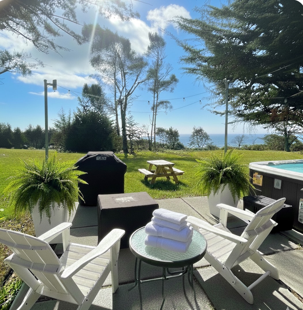 Escape to this charming ocean-view Airbnb for a romantic getaway. The newly renovated Timbers Suite of Mendocino provides a spa, BBQ grill, full kitchen, full bathroom, queen-size bed, and sitting area. Explore three private trails steps away and enjoy stunning sunset views. During the day, keep an eye out for whales! With Russian Gulch State Park just a short 1-mile walk and Mendocino less than a 5-minute drive away, this retreat offers the perfect blend of relaxation and adventure.