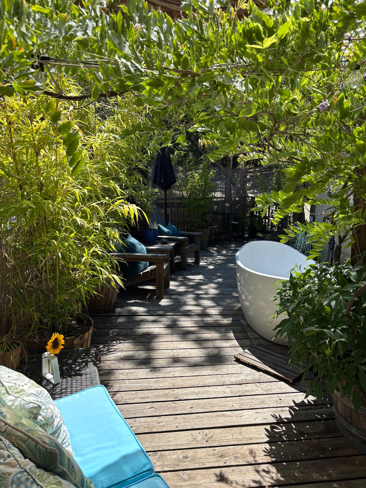 If you're looking for a unique way to experience nature that still offers the comforts of home, come see what Yurt Life is all about! Tucked away in a manzanita grove and perched on a cliff with the river below, the space offers privacy, views, and close access to the river. This little yurt packs a big punch: kitchenette, comfy lounge chairs, queen bed, table, wifi and ceiling fan. And rather than being a dreaded experience, the attached bathroom with epic views is one of the best features!