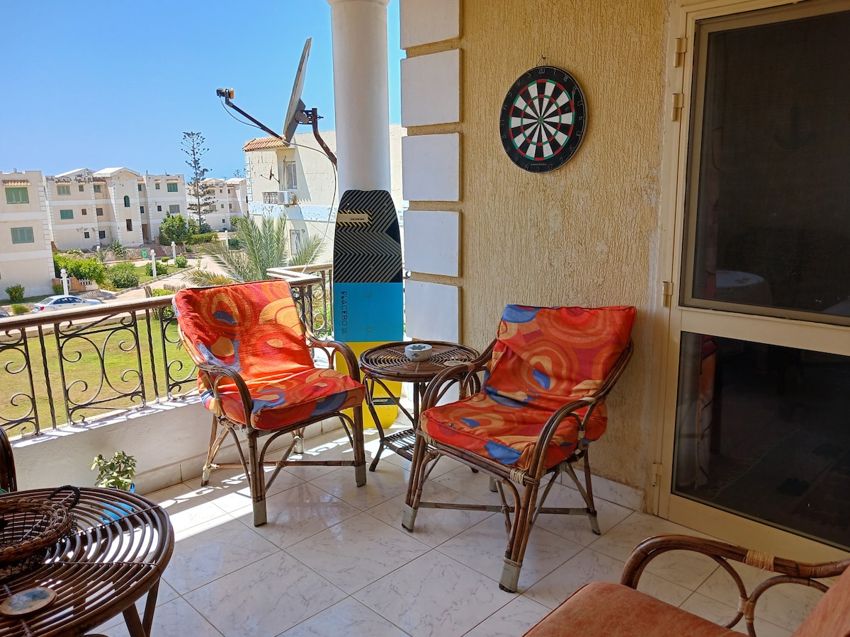 Relax with the whole family at this peaceful chalet with a stunning beach view. You will feel at home and enjoy your vacation. The compound has all stores needed and outings to enjoy your stay. Private compound. Security. Full beach, pool, and lake access. Compound has 6 pools available. Compound is 10 mins away from large hyper market. 3 km Beach area. Full amenities. Third floor. Note: A/C available in a single room. There's natural A/C due to air flow in the rest of the chalet.