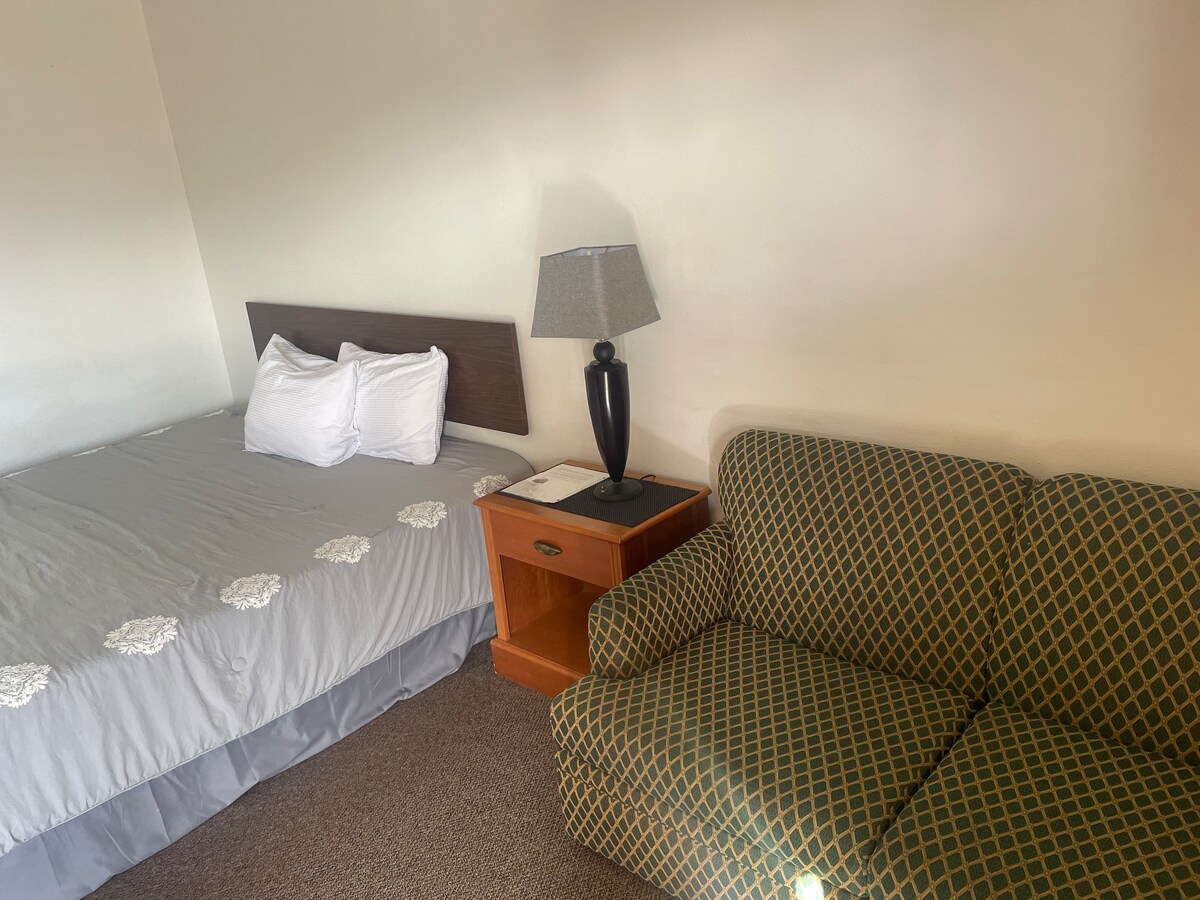 Our Studio style hotel room has new flooring and furniture. There is a queen bed, mini fridge, side table, microwave, toaster oven, dresser, Wi-Fi, cable tv, and a chair. Plenty of room to park trailers and a backyard space for everyone to use! We do require photo ID to be sent via Airbnb messages to verify your identification before you're able to access the property.