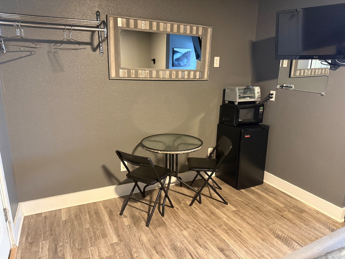 Our studio style hotel room is completed with new flooring and furniture. Includes a queen bed, side table, mini fridge, microwave, toaster oven, dresser, free Wi-Fi, cable tv, and a side chair. Free parking with room for trailers, and a backyard space. We do require photo ID to be sent via Airbnb messages to verify your identification before you’re able to access the property.