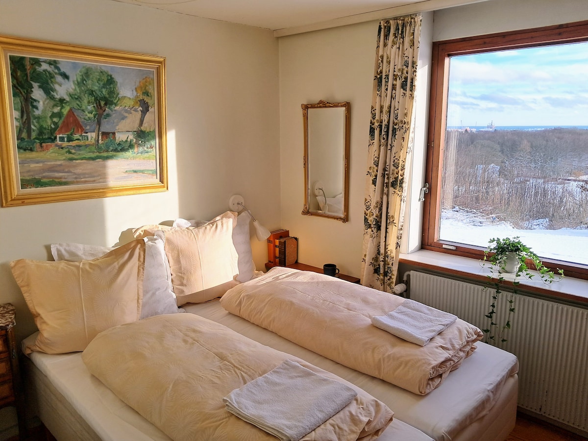 Lejligheden er beliggende tæt på skov og lille havn med badebro. Lejligheden har egen parkeringsplads i et roligt boligkvarter. Tæt på indkøbsmuligheder