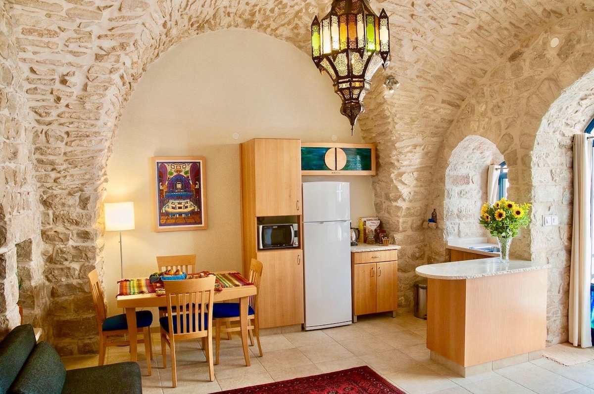 Welcome to the Artist Quarter Guesthouse B&B. We are located in the heart of Tzfat. This accommodation has beautifully restored and renovated 300-year-old authentic stone domed rooms with modern conveniences. This unit has a kitchen, shower, bathtub, AC/heat and free internet and is fully equipped for Shabbat. There is a courtyard with outside dining and a roof top balcony with stunning views of the Mt Meron. And to top it off, we serve a kosher* vegetarian breakfast to the room in the morning.