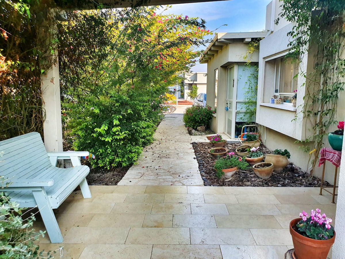 A cozy, comfortable, apartment in a private house in a village near Nazareth. Beautiful setting with a yard, and a gazebo for outdoor dining or just hanging out . Lots of sites and activities for adults and children in the village and near-by. A spiral staircase leads you up to your private quarters with a view of the horse farm next door and the hills beyond. Ideally suited for a family of 4, but there is a fold-out bed-chair for another small person.